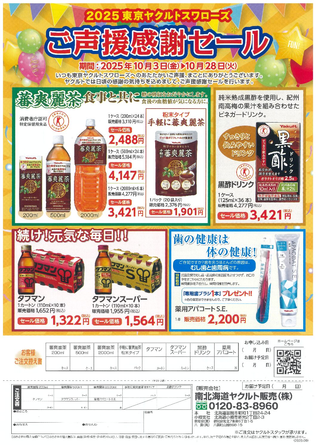 南北海道ヤクルトでは、日頃のご声援への感謝を込めて「2025 東京ヤクルトスワローズ ご声援感謝セール」を実施中です。