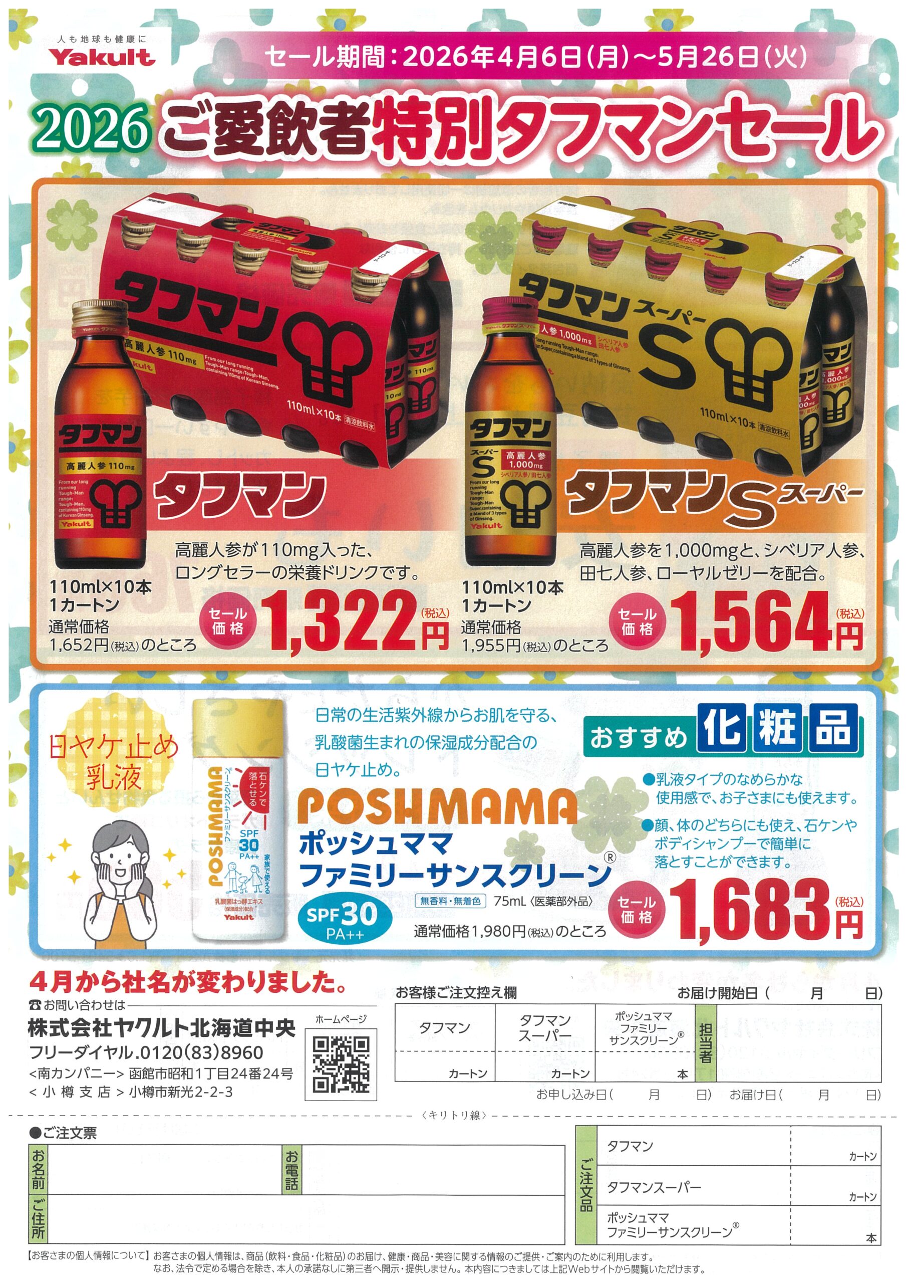 株式会社ヤクルト北海道中央 南カンパニーでは、日頃のご愛飲、ご利用への感謝を込めて、「タフマン」および「ポッシュママ ファミリーサンスクリーン」の特別セールを開催いたします。